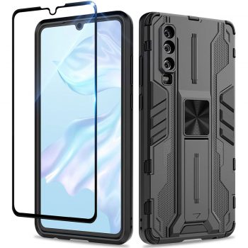 Btstring Hülle kompatibel mit Huawei P30 mit Schutzfolie, Militär Standard Cover Case Standfunktion Handy Hüllen Schwarz